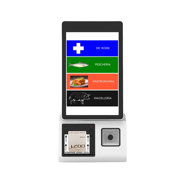 Dispenser Ticket elettronico con stampante Termica 58 mm e display Touch screen 10.1″, gestisce emissione fino a 6 code (6 pulsanti)
